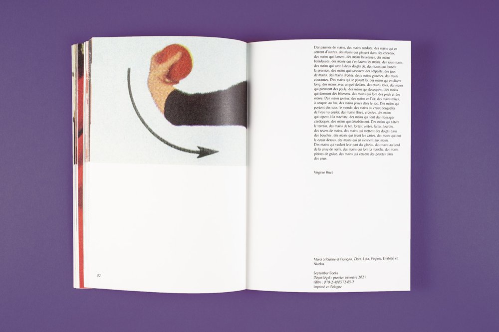 "Des paumes de mains, des mains tendues, des mains qui en serrent d’autres, des mains qui glissent dans des cheveux, des mains qui fument, des mains heureuses, des mains baladeuses, des mains qui s’en lavent les mains, des sous-mains, des mains qui sont à deux doigts de, des mains qui foutent la pression, des mains qui caressent des serpents, des jeux de mains, des mains droites, deux mains gauches, des mains courantes." Virginie Huet, extrait de la postface.