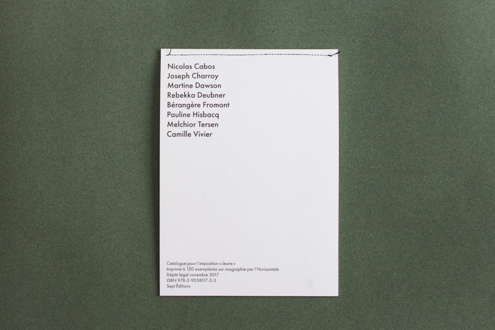Fanzine réalisé à l’occasion de l’exposition "Jeune" à la galerie du Crous à Paris pendant PhotoSaintGermain puis au CACN de Nîmes, sur une proposition de Rebekka Deubner et Pauline Hisbacq. Avec des images de Nicolas Cabos, Joseph Charroy, Martine Dawson, Rebekka Deubner, Bérangère Fromont, Pauline Hisbacq, Melchior Tersen et Camille Vivier, autant de variations sur le thème de la jeunesse.